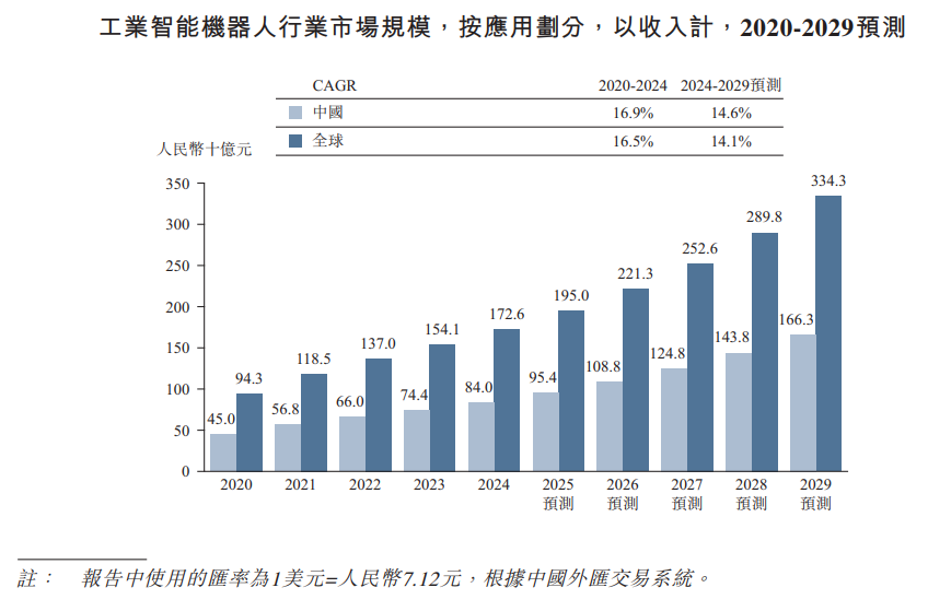 2020年至2024年,工业智能机器人行业在中国及全球市场均实现较快增长。中国市场规模由2020年的人民币450亿元增长至2024年的人民币840亿元,CAGR为16.9%。同期,全球工业智能机器人市场规模由人民币943亿元增长至人民币1726亿元,CAGR为16.5%。展望未来,预计到2029年,中国工业智能机器人行业市场规模将达到人民币1663亿元,2024年至2029年的CAGR为14.6%。同期,全球市场规模预计将增长至人民币3343亿元,CAGR为14.1%。
