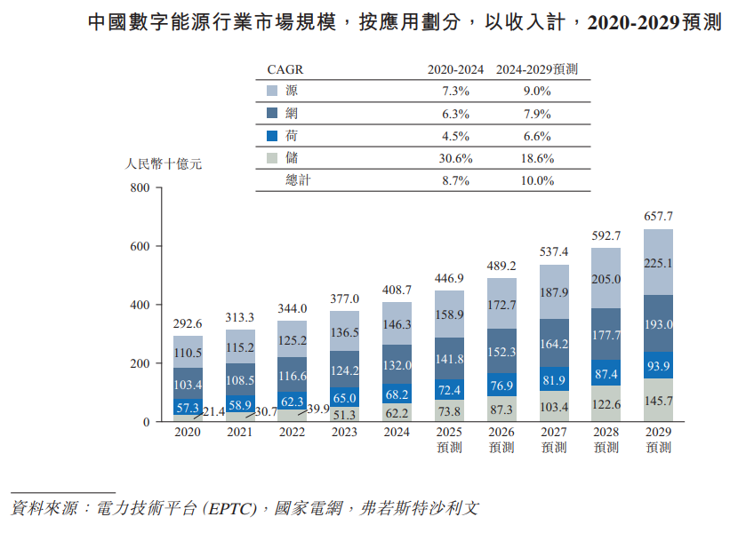2020年至2024年,中国数字能源行业整体规模由人民币2926亿元增长至人民币4087亿元,CAGR为8.7%。各细分环节均呈现不同程度的扩展,其中源侧规模由人民币1105亿元提升至人民币1463亿元,网侧由人民币1034亿元增至人民币1320亿元,荷侧从人民币573亿元上升至人民币682亿元,储侧则由人民币214亿元显著扩大至人民币622亿元。预计到2029年,行业整体规模将增至人民币6577亿元,对应2024至2029年的CAGR为10.0%。未来各细分方向仍将保持增长,其中源侧预计提升至人民币2251亿元、网侧升至人民币1930亿元、荷侧扩至人民币939亿元,而储侧预期增长至人民币1457亿元。